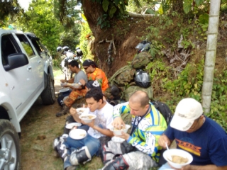 En Tuluá descubrimos que las famosas Metzeler Tourance, hechas en China, se ponen porosas y causan esa pinchada que se resuelve únicamente con la compra de una llanta nueva… algo más de dos horas incluido el desayuno, muy bien atendidos… seguimos el camino, sin novedad… bordeando el rio Cauca… nuestra amada naturaleza nos entregó temperaturas cercanas a los 40ºC y nadie, nadie perdió la sonrisa.